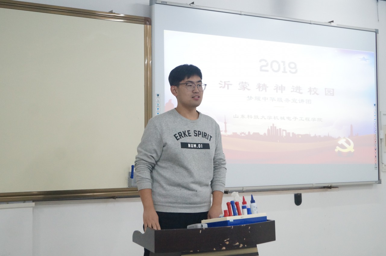 点击:11月3日-11月8日,在新中国成立70周年之际,为加强爱国主义教育,大力弘扬“沂蒙精神”,机电学院开展了“沂蒙精神进校园”红色文化宣讲活动。此次宣讲活动由梦耀中华服务宣讲团主讲,机电学院2019级5个专业共530余名同学参与。