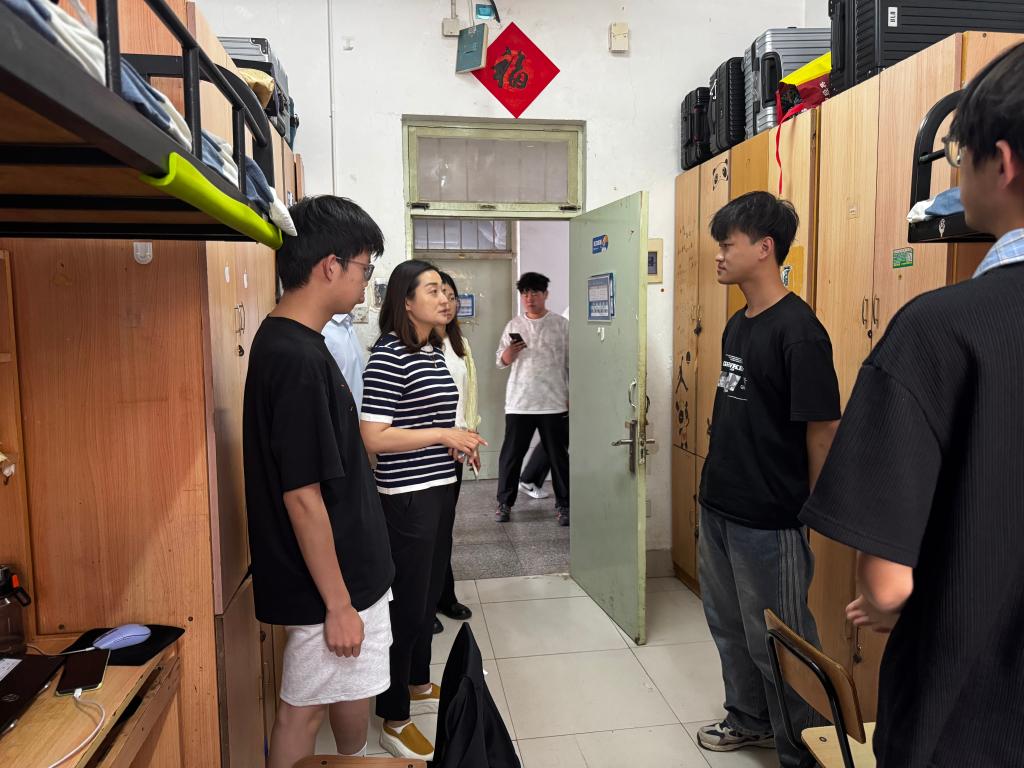 检查过程中,刘梅月督促辅导员提醒各年级学生落实常态化通风消毒措施,强化饮食健康管理。在走访毕业生宿舍时,她认真了解学生考研就业进展、毕业设计完成情况,鼓励毕业生做好规划;面对低年级学生,她细致了解学业适应状况与思想动态,暖心叮嘱:“有困难随时找辅导员,学院永远是你们的坚强后盾。”同时,她对辅导员队伍提出明确要求,通过强化日常走访与深度关怀机制,将学生工作做深做实。