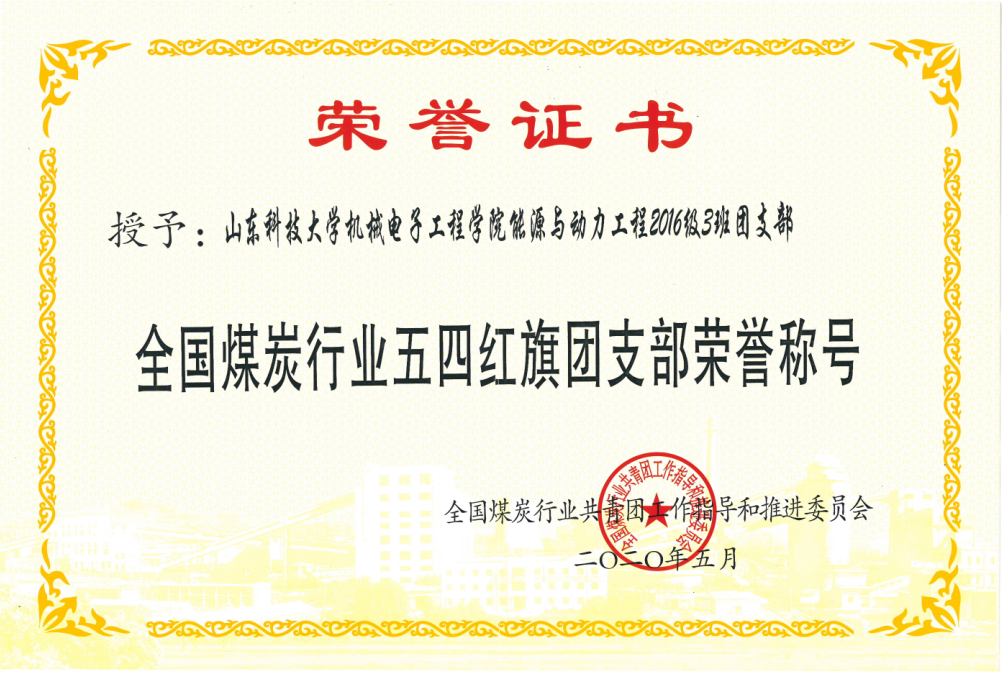 点击:日前,全国煤炭行业共青团工作指导和推进委员会对2019年度全国煤炭行业优秀团委(团支部)、团干部和共青团员进行了表彰,Beat365亚洲版官网Beat365亚洲版官网能源与动力工程2016级3班团支部荣获“全国煤炭行业五四红旗团支部”称号。