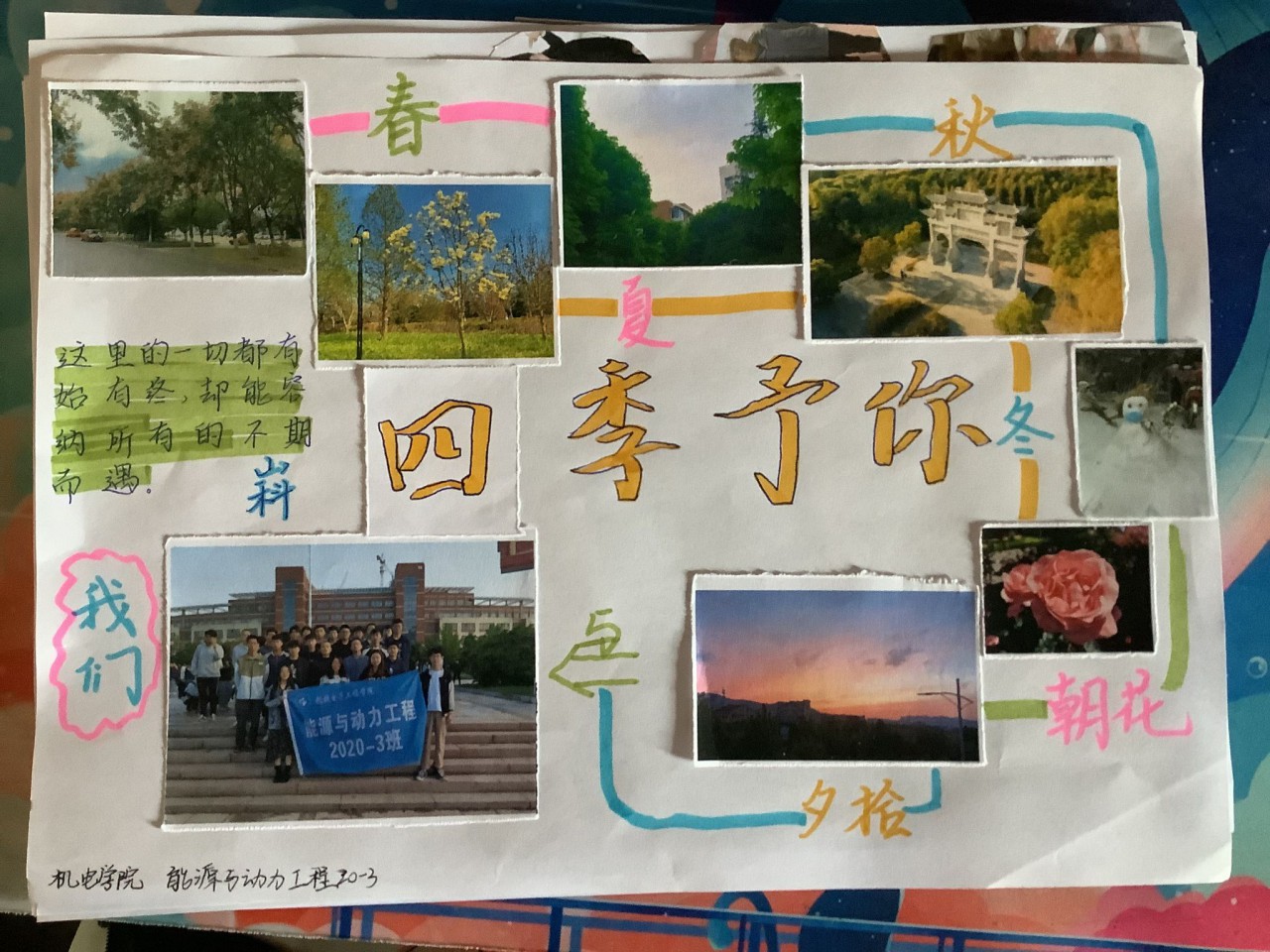 参赛作品围绕风景、人物、生活等多个方面展开,同学们利用照片拼接出自己的内心世界,充分表达出心中所爱。机电20-3班的作品利用日出、日落、夜晚的天空景色展现出光阴变化,同学们向着太阳的身影体现了乐观向上的内心世界;能源20-3班的作品则是科大校园的四季交替和班级合影交融在一起,体现了他们朝气蓬勃、团结向上的精神;机设20-2班的作品中巨轮和高铁交相辉映,科技工作者的专心研究与军人在南湖游船前面对党旗的庄严宣誓场景,表达出青年学子肩负重任,立志报效祖国的决心。经过评选,能源20-3班获得一等奖,机电20-3班、机设20-1班获得二等奖,机电20-5班、机设20-2班、智造20-3班获得三等奖。
