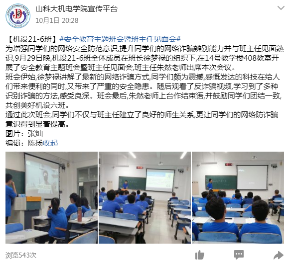 点击:为增强学生安全防范意识,提高学生安全防范能力,营造和谐安定的校园环境,近日,机电学院组织开展形式多样的安全主题教育系列活动,扎实推进学生安全教育和管理工作。 各年级辅导员通过组织各班开展“防范网络诈骗•创建无诈班级”主题班会,通过案例讲解、视频学习等形式普及反诈知识,帮助同学们树立正确的价值观、消费观,提高对电信诈骗违法行为的识别能力和防范意识。