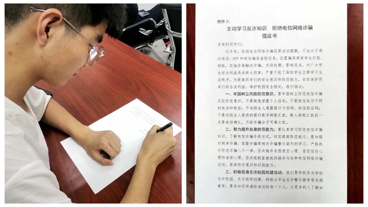 同学们阅读、签署防诈骗倡议书 组织开展大学生心理健康教育和生命安全教育,加强与学生家长的沟通,做好家校协同育人,培养学生积极、乐观、勇敢、自信的健康人格。