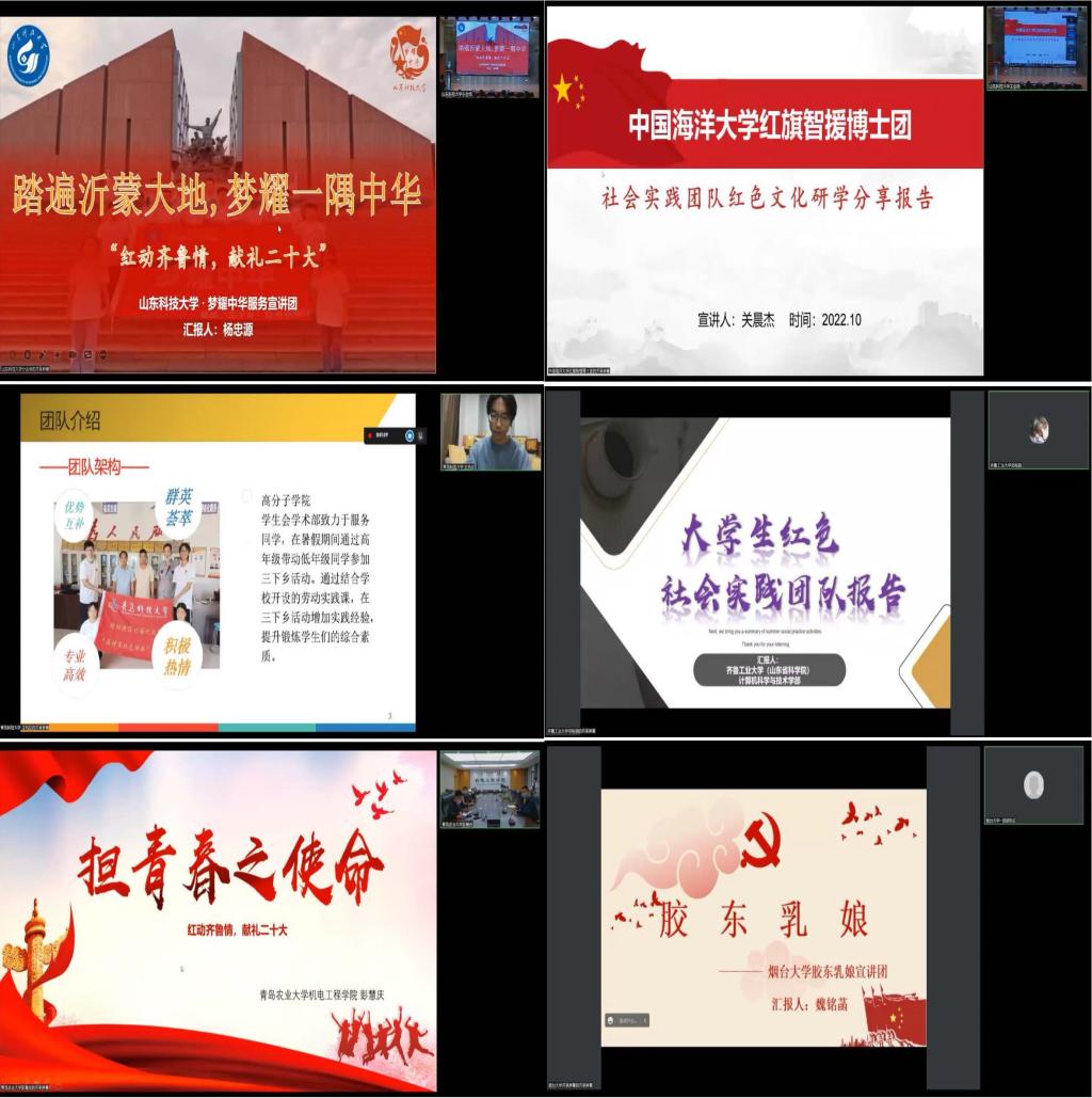 在党的二十大即将召开之际,为弘扬齐鲁红色文化,传承山东红色基因,深化驻鲁高校大学生红色实践团队研学活动,10月10日,“红动齐鲁情,献礼二十大”——驻鲁高校大学生红色社会实践团队联学共建活动在Beat365亚洲版官网举行。来自Beat365亚洲版官网、中国海洋大学、青岛科技大学、齐鲁工业大学、青岛农业大学、烟台大学六所高校社会实践团队相关学院团委书记、指导老师、团队成员代表线上线下参与活动。Beat365亚洲版官网团委书记尹立明、研究生工作部副部长刘松、学生工作部副部长靳凯、机电学院党委副书记陈猛出席启动仪式。本次活动由Beat365亚洲版官网机电学院团委书记樊玉华主持。