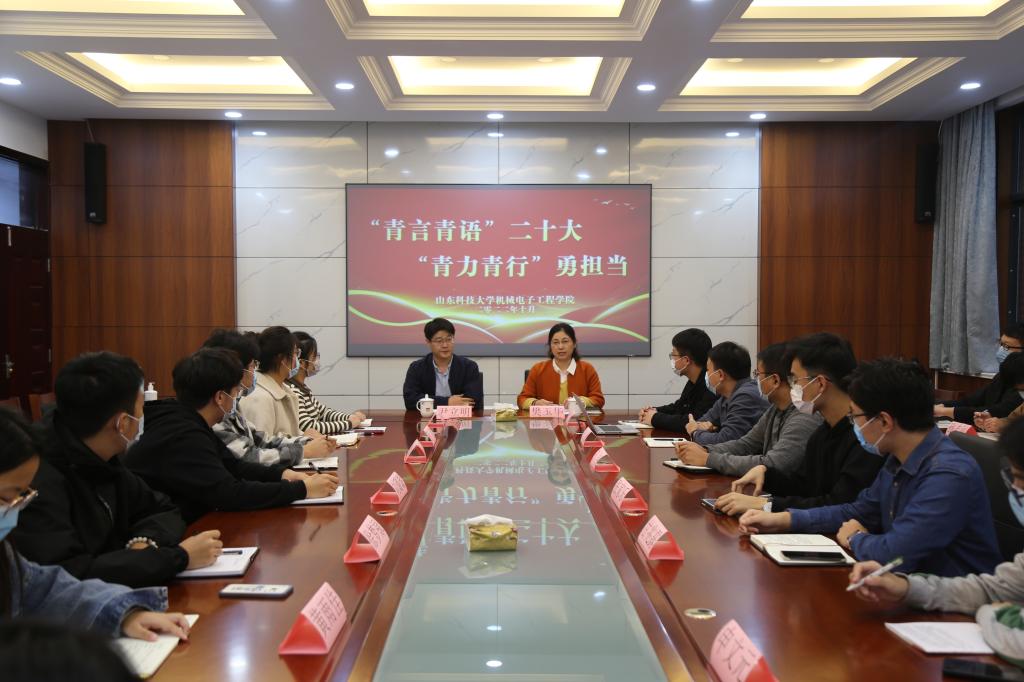 点击:为深入学习宣传贯彻党的二十大精神,引导广大青年牢记习近平总书记对青年的殷切嘱托,激励青年学生勇担时代使命,10月26日下午,机电学院在J8-209会议室举办了“‘青言青语’二十大、‘青力青行’勇担当”主题座谈会。校团委书记尹立明应邀出席座谈会,小平科技创新团队和梦耀中华服务宣讲团成员代表参加座谈。座谈会由机电学院团委书记樊玉华主持。