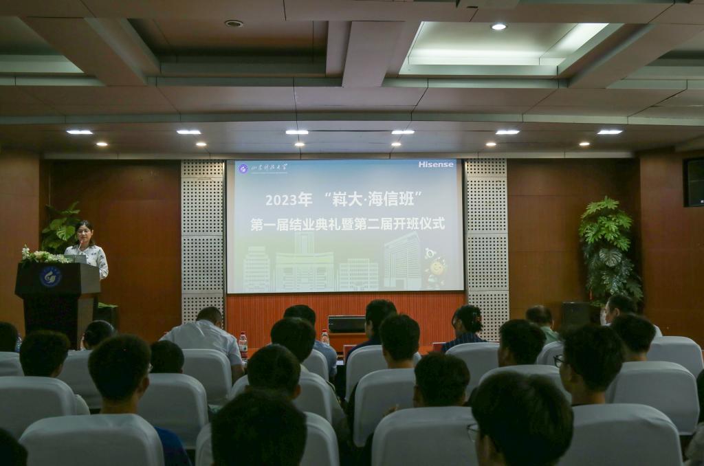 随后,梁艳华为第一届学员颁发结业证书,海信视像科技人力资源部招聘经理贾玉玉宣读第二届学员名单。刘广劼与王荣超为“嵙大·海信班”企业班主任丁觅坤、校内班主任樊玉华颁发聘书。海信视像科技工艺部结构工程师、机电学院硕研2022届毕业生高宇作为优秀毕业生代表发言:“我们必将勤学苦练、勇于实践、全面发展、敢于担当,不辜负老师和领导寄予的期望,主动利用学校和海信集团提供的平台资源,百舸争流、更创佳绩。”