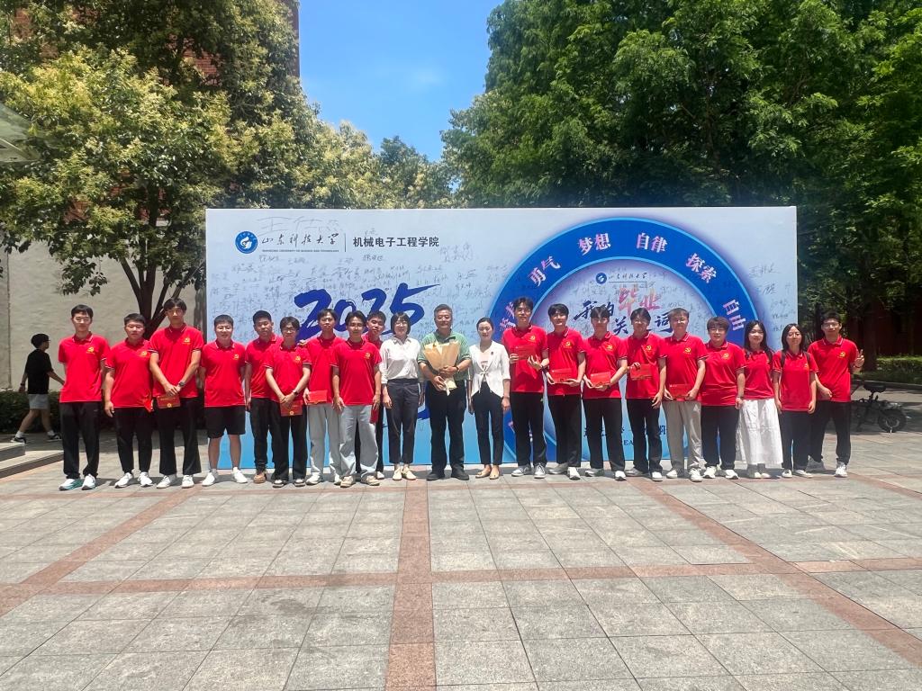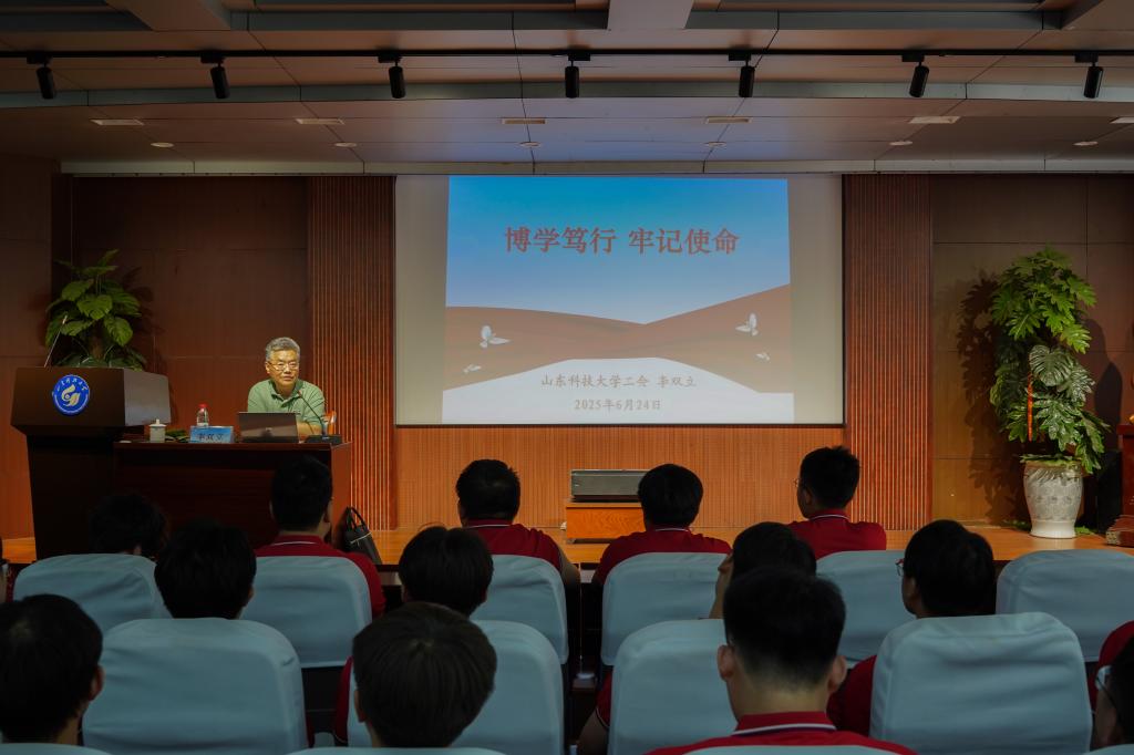 党课中,李双立以Beat365亚洲版官网74年发展历程为经,以中国共产党百年奋斗史为纬,以机电学院成长轨迹为线,为毕业生党员铺展了一幅“校史-党史-院史”交织的壮阔画卷。他深情回顾了学校从1951年建校至今的峥嵘岁月,从淄博洪山的初创岁月到济南、泰安的扎根发展,再到青岛校区的跨越腾飞,生动诠释了“惟真求新”校训的时代内涵与精神传承。谈及学校在分合搬迁中淬炼出的“坚韧不拔、发奋图强”精神品格,以及在多校合并中凝聚的“爱校奉献、敬业实干”文化传统时,他的讲述中饱含深情:“这些基因密码,是每一位科大人最珍贵的‘精神原乡’。”