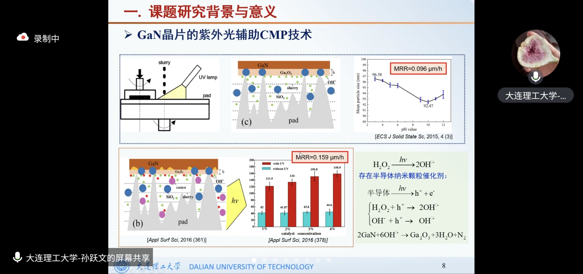 大连理工大学高性能制造硕博第六学生党支部孙跃文同志进行主题为《氮化镓的光电化学机械抛光加工》的科研分享,对氮化镓光电化学机械抛光(PECMP)原理、氮化镓晶片的PECMP加工体系关键问题的研究以及氮化镓晶片的光电化学机械抛光试验研究进行了详细介绍,并就与会人员提出的问题进行了耐心的解答。